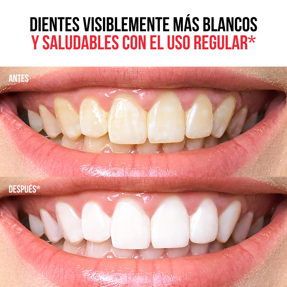 - Blanquea – elimina de forma segura las manchas y aclara los dientes para una sonrisa radiante.