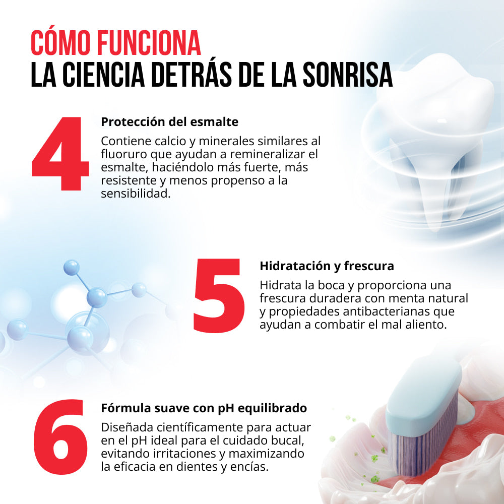 Combinada con sílice hidratada, esta combinación natural crea una barrera protectora contra los ataques de ácido, lo que proporciona dientes más fuertes que resisten la caries y la sensibilidad.