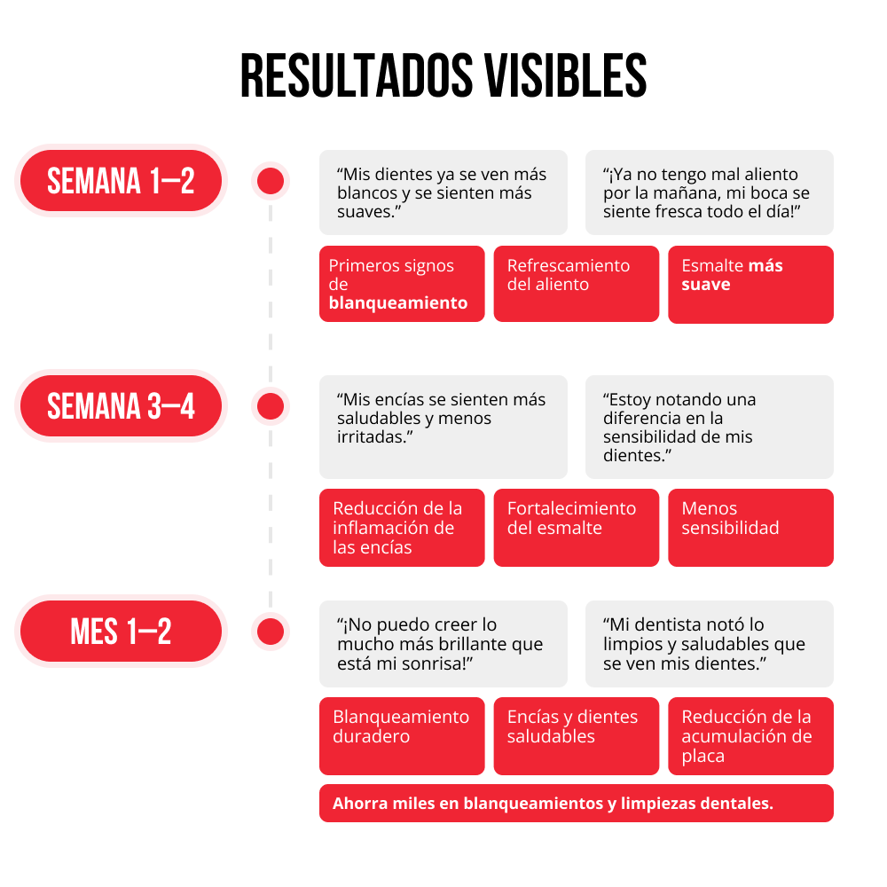 Muchos usuarios notan una sonrisa más limpia y brillante después de solo 1-2 semanas, y con el uso regular y consistente, el esmalte más fuerte y una sensación más cómoda en las encías se hacen notables con el tiempo.