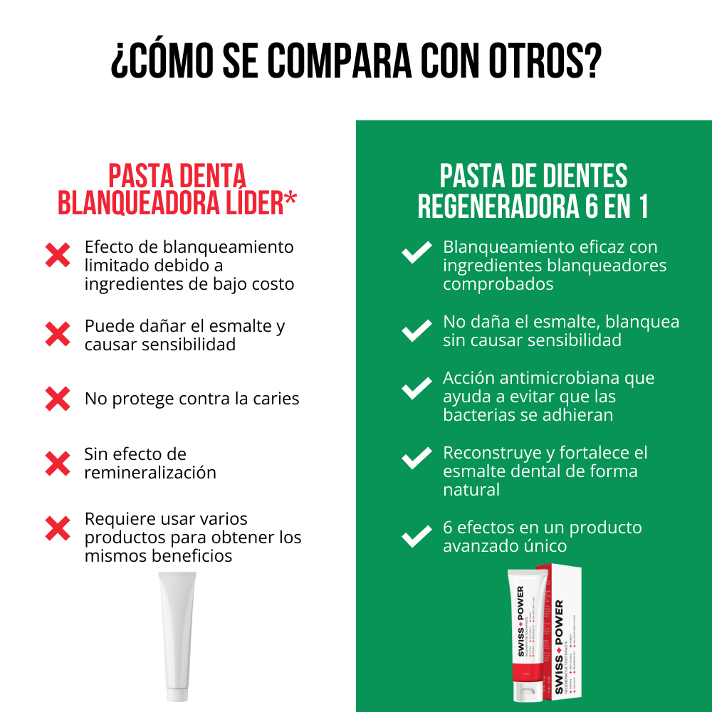 Recomiendo a mis pacientes la pasta de dientes regeneradora 6 en 1 SWISS+POWER para un cuidado bucal integral, que combina prevención, protección y restauración en un práctico producto.