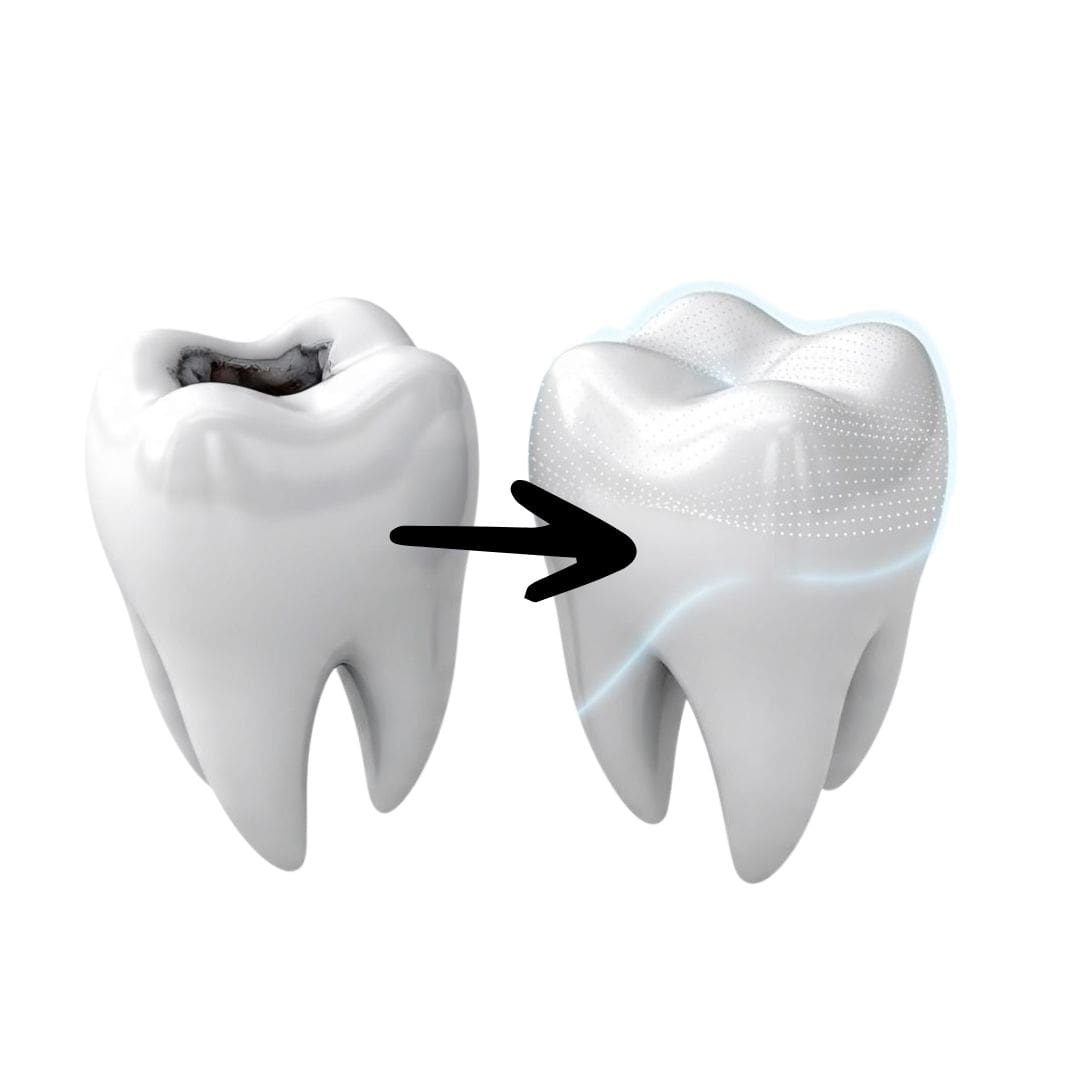 - Restaura – repara el daño microscópico para dientes más saludables y fuertes.